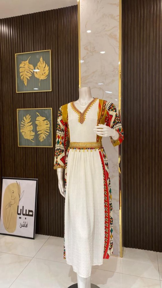 استلهمي سحر الماضي بإطلالة تنبض بالأناقة مع فستان تراثي إيلاف من صبايا فاشون. تصميم يجمع بين أصالة التراث العربي ولمسات عصرية أنيقة، ليمنحك حضوراً متفرّداً يعكس هويتك بثقة وأناقة.