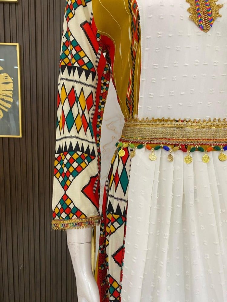 - الخامة: قماش فاخر بخياطة دقيقة وتطريزات مستوحاة من الزخارف التقليدية.