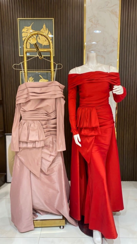 - التصميم: فستان طويل بقصة أنثوية ناعمة، مع تفاصيل دقيقة وراقية تزيد من فخامته.