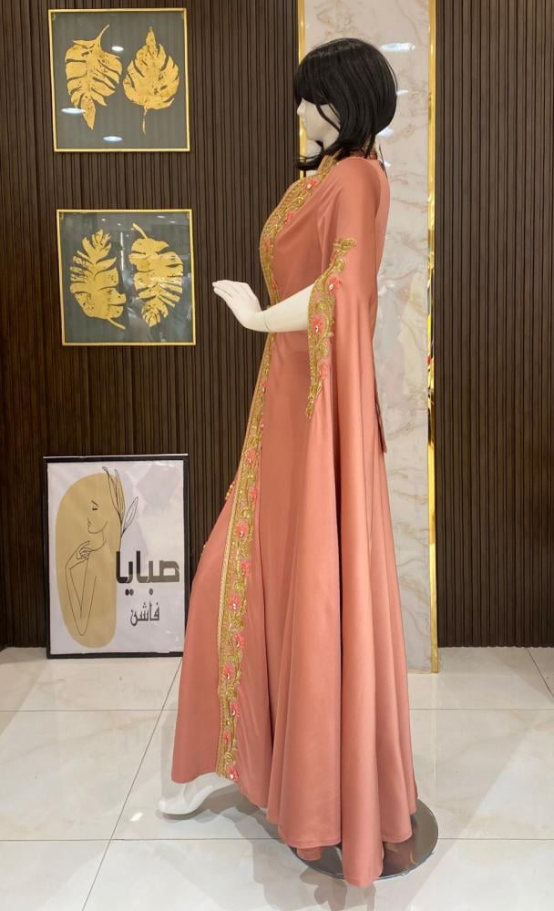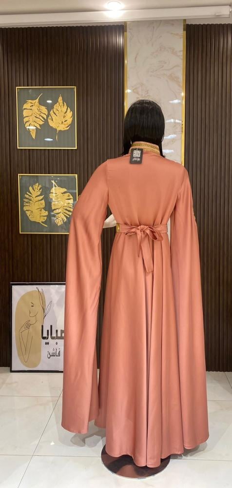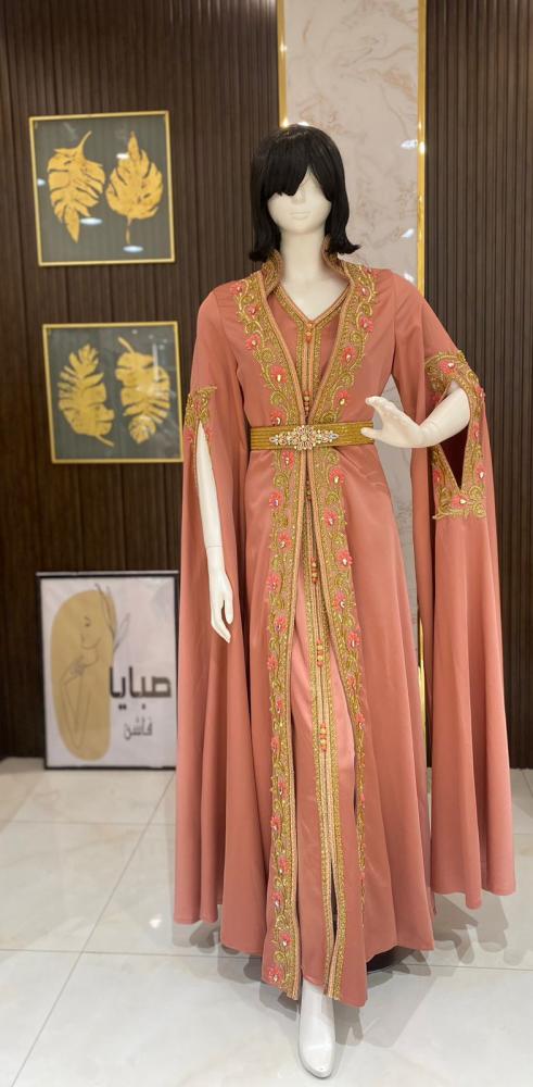 • التصميم: واسع بأكمام فراشة، مزين بتطريز ذهبي فاخر