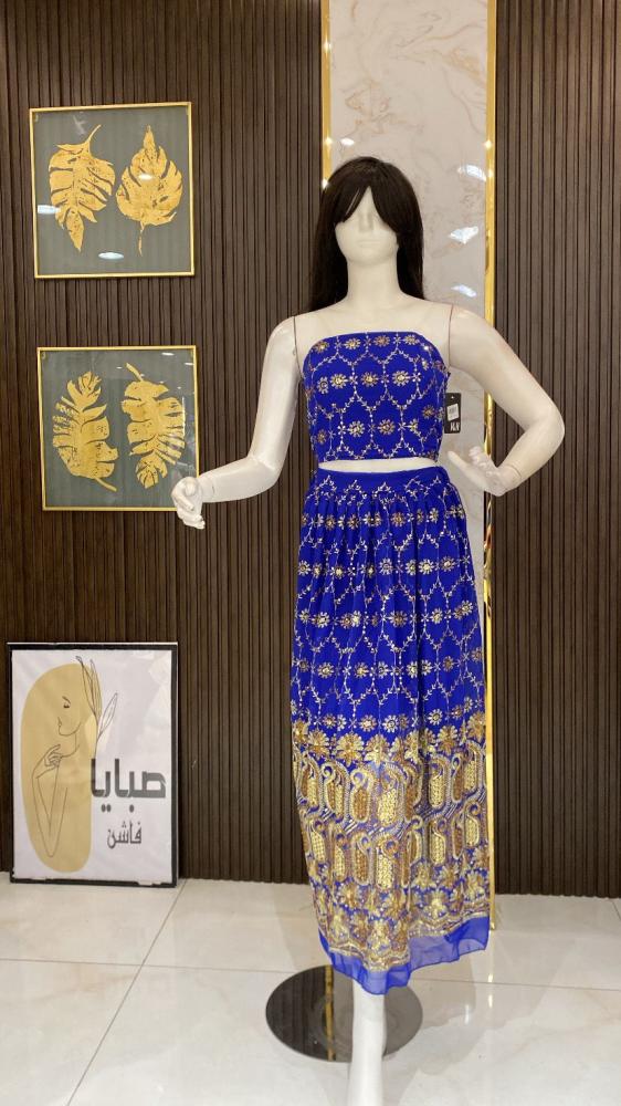 - التصميم: طقم مكون من توب مطرز وتنورة واسعة مع شال فاخر.