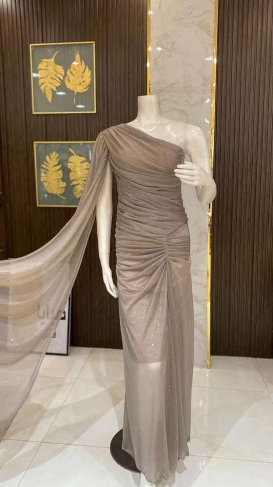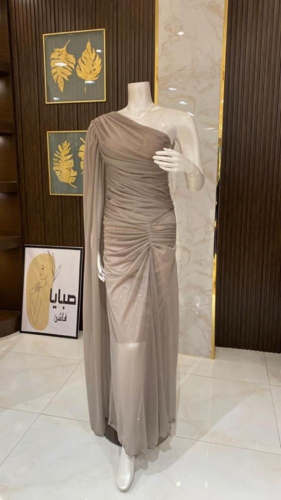 فستان طويل مع شال جانبي أنيق يضيف لمسة من الفخامة، مع تفاصيل مميزة تنسجم مع الأنوثة والرقي.